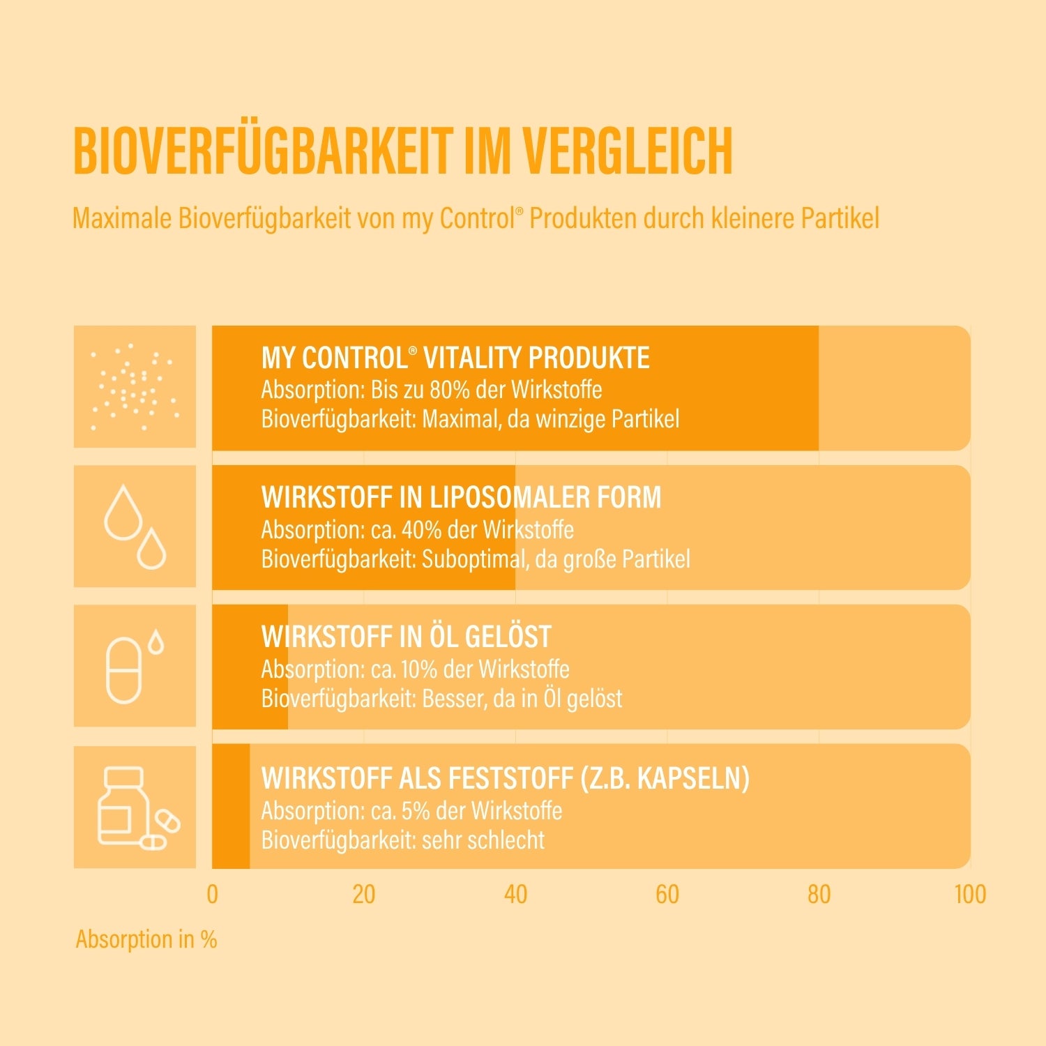 my Control® Vitality bietet eine neue Produktreihe mit einer bahnbrechenden Technologie, die die Bioverfügbarkeit von Wirkstoffen im Körper erhöht, um Leistung zu maximieren und unsere empfindlichen Ressourcen zu schonen. Beide Effekte markieren einen herausragenden Vorteil gegenüber anderen Produkten und repräsentieren die Trends unserer Zeit.