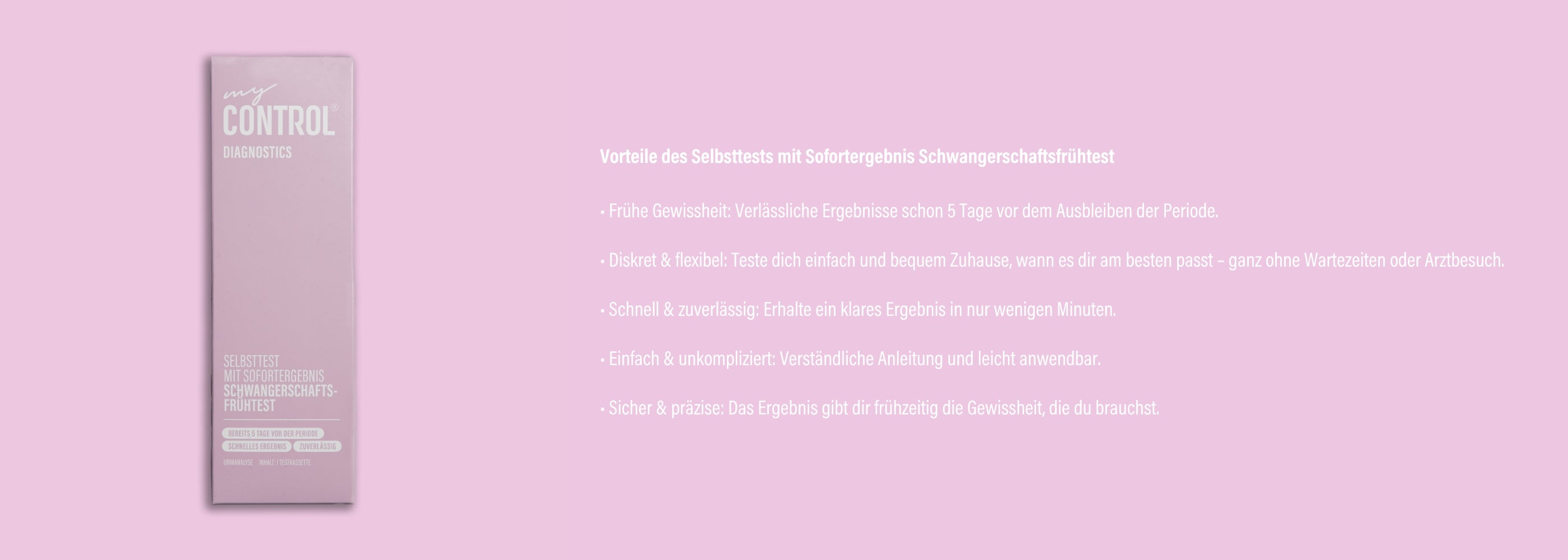 Der my Control® Diagnostics Selbsttest mit Sofortergebnis – Schwangerschaftsfrühtest mit Indikator weist hCG im Urin in einer Konzentration von 10 mlU/ml oder mehr nach. Der Test wurde nach dem internationalen WHO-Standard standardisiert. Die Zugabe von LH (300 mlU/ml), FSH (1.000 mlU/ml) und TSH (1.000 μlU/ml) zu negativen (0 mIU/ml hCG) und positiven (10 mlU/ml hCG) Proben zeigte keine Kreuzreaktivität.