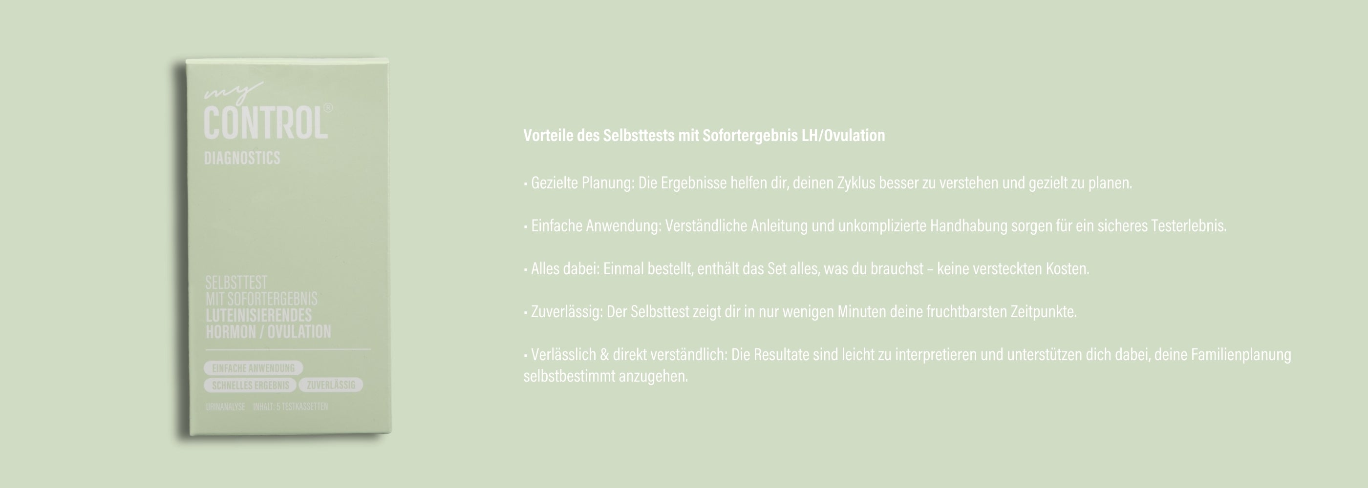 GEWISSHEIT BIS ZU 5 TAGE VOR PERIODE BESTIMMUNG DER FRUCHTBAREN TAGE TESTERGEBNIS IN WENIGEN MINUTEN KEIN ARZTBESUCH NÖTIG SCHNELL UND DISKRET EINFACHE HANDHABUNG ALLES INKLUSIVE