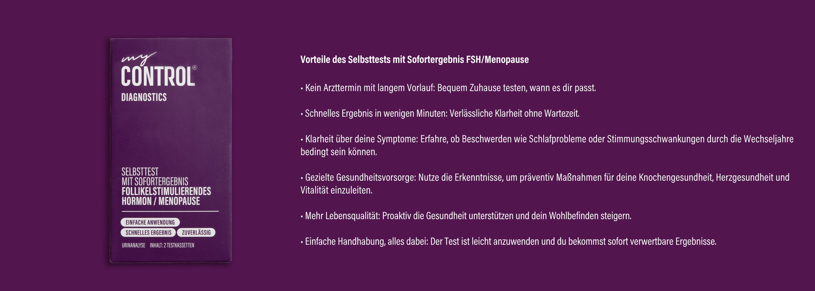 Das my Control® Vitality Female Support Complex Spray ergänzt den Test optimal und wurde speziell entwickelt, um deinen Körper im Menopause-Übergang sowie während des gesamten weiblichen Zyklus zu unterstützen. Es bietet Unterstützung bei typischen Wechseljahresbeschwerden wie Hitzewallungen, Stimmungsschwankungen. Der Female Support Complex kombiniert wertvolle Pflanzenextrakte, die seit jeher für ihre positive Wirkung auf die Frauengesundheit geschätzt werden und deren Wirksamkeit inzwischen wissenschaftlich belegt ist. Diese einzigartige Formulierung fördert die innere Balance und unterstützt das Zusammenspiel von Körper und Seele – sowohl im monatlichen Zyklus als auch in allen Phasen der Menopause. Mit einer 8-fach höheren Bioverfügbarkeit sorgt das Spray für eine optimale Aufnahme der Wirkstoffe und die Wirkung der Formulierung wurde in einer Beobachtungsstudie bewiesen.