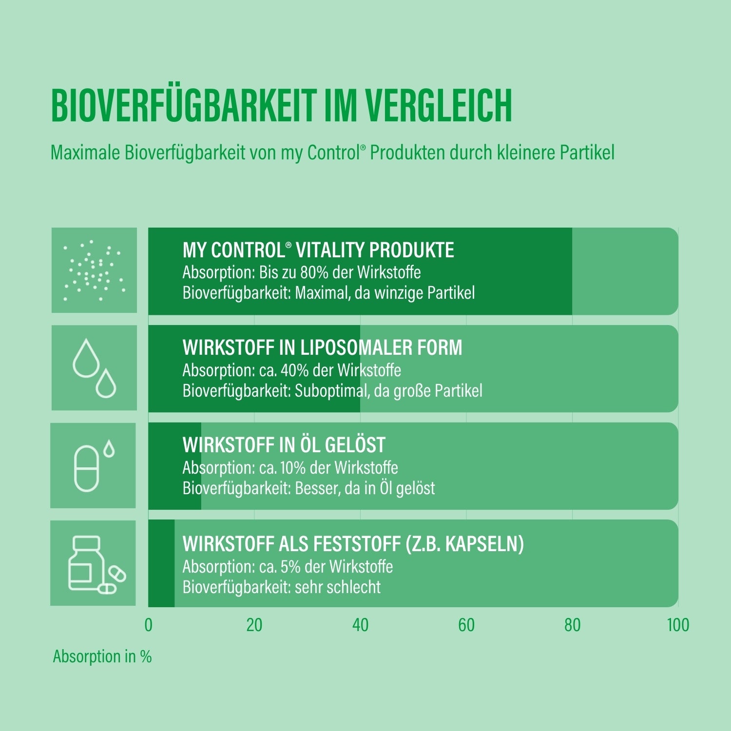 my Control® Vitality bietet eine neue Produktreihe mit einer bahnbrechenden Technologie, die die Bioverfügbarkeit von Wirkstoffen im Körper erhöht, um Leistung zu maximieren und unsere empfindlichen Ressourcen zu schonen. Beide Effekte markieren einen herausragenden Vorteil gegenüber anderen Produkten und repräsentieren die Trends unserer Zeit.